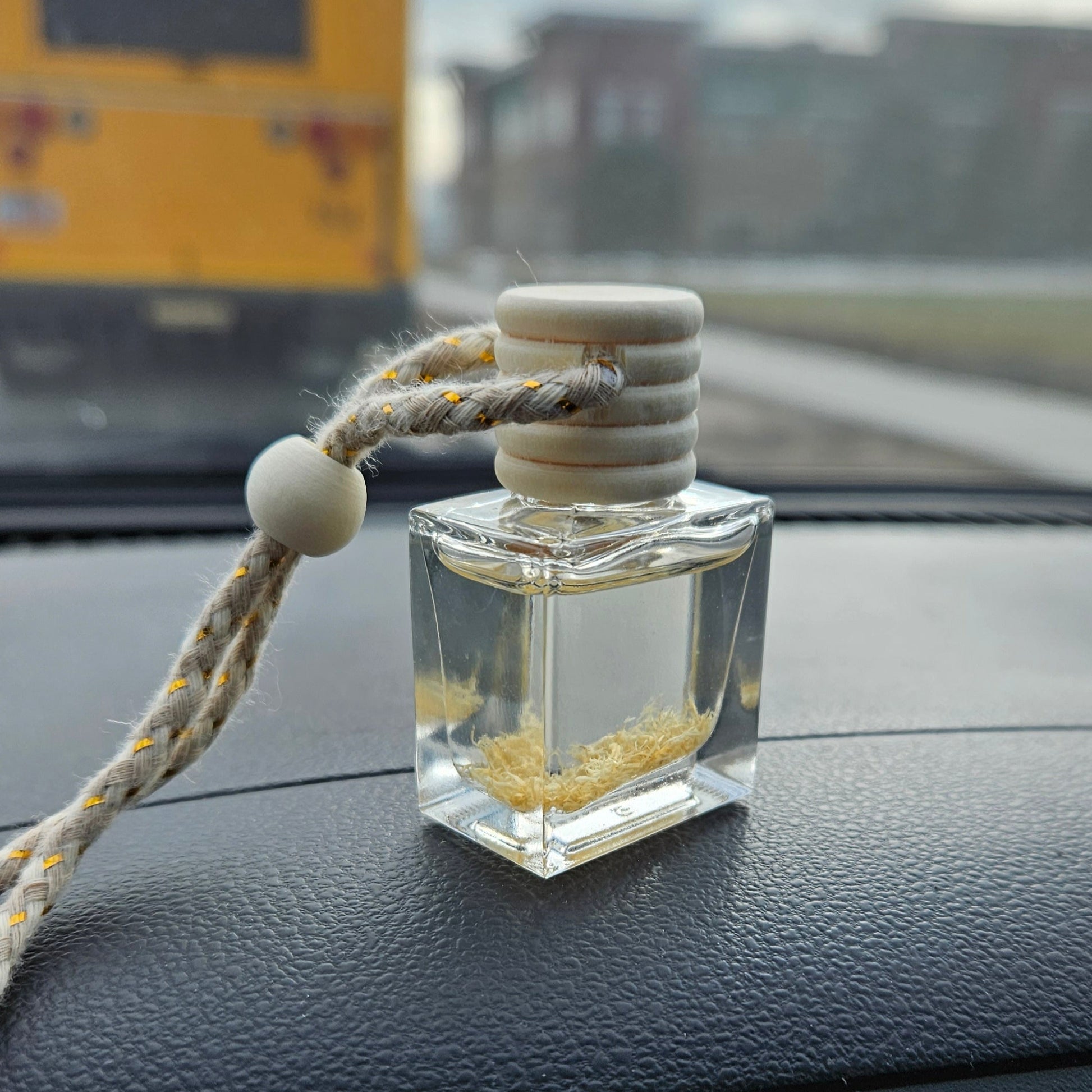 To use, remove the cork lid, loosen the white inner stopper, replace the cork, and turn the diffuser upside down until the lid is saturated. Then simply hang the diffuser from your rearview mirror and let the enchanting fragrance accompany you on every journey.